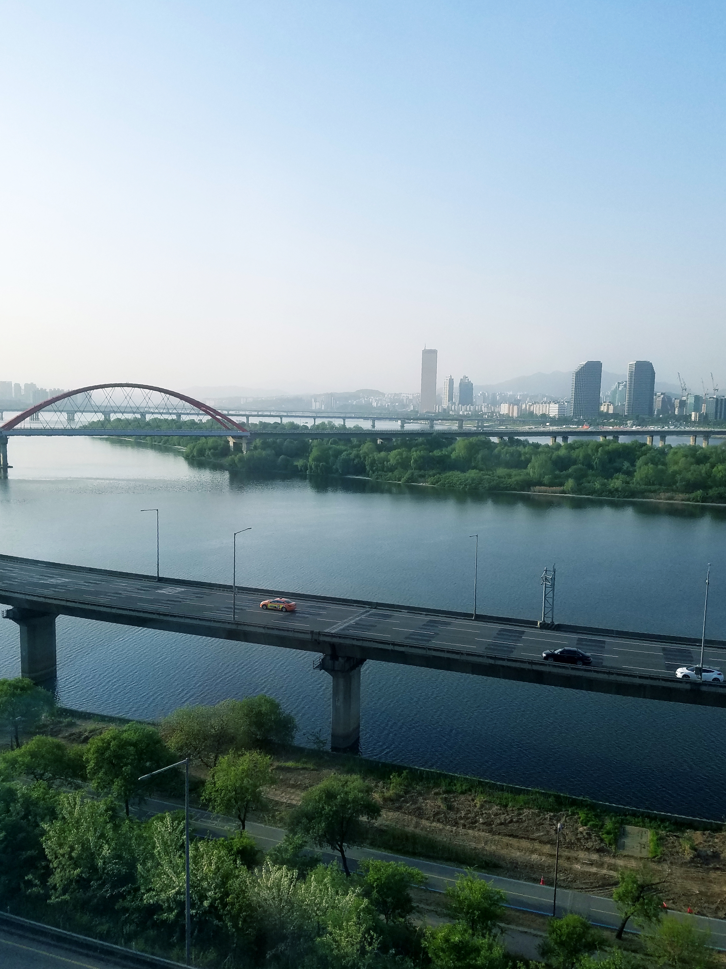 Waking at 4:30 AM has its advantages. The view from our wall of window is amazing: the wide Han River splitting around a green wooded island, spanned by one red bridge nearby and several others in the distance, the skyscrapers circling the skyline, the misty mountains rising beyond them. We watch the day come in over Seoul and drink coffee and discuss our plans, and it is perfect.