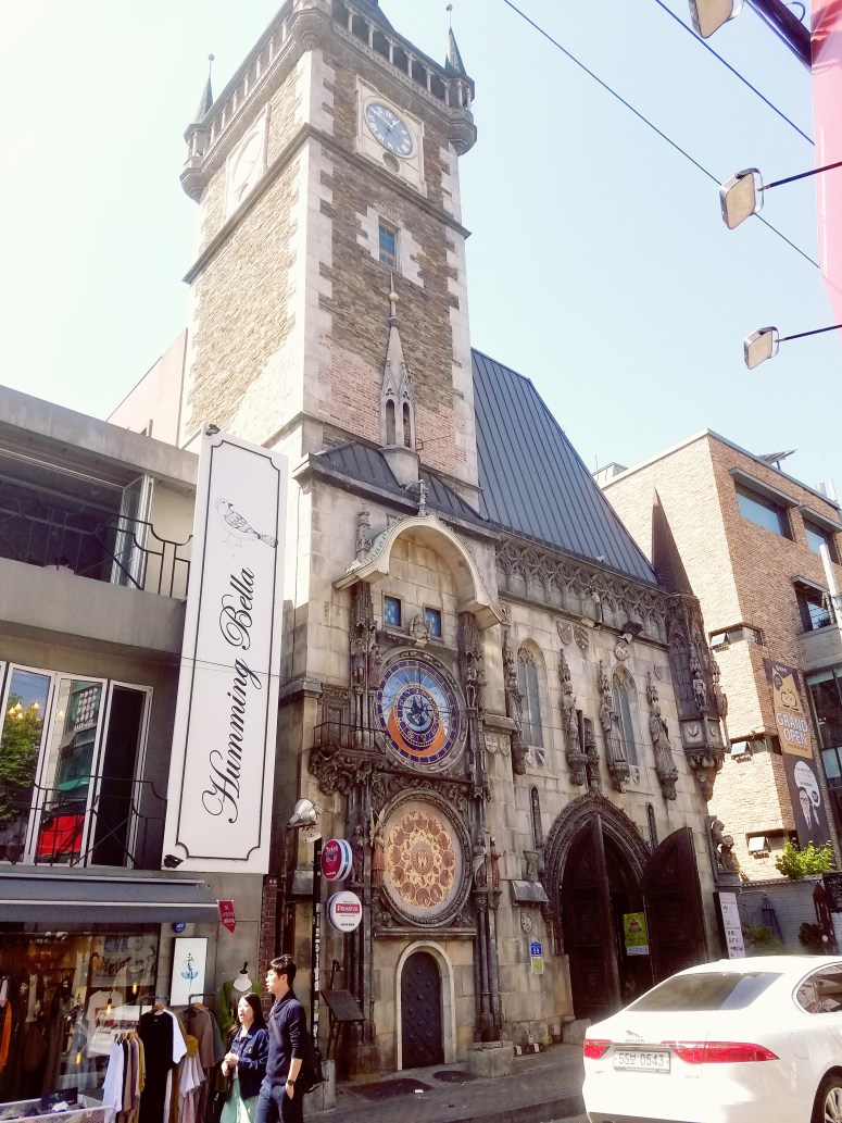 We spend a lot of day two wandering the endless, and endlessly fascinating, Seoul streets. You never know what your eyes will behold next in this city. On one street we find a solid black Lamborghini, parked for so long that people have written in the dust on it; on another stands a narrow, gothic-cathedral-looking edifice complete with a soaring clock tower, which turns out to be the Castle Praha Hongdae; and on a third appears a large, square white building, smooth with nothing on it but doors and the words GENTLE MONSTER.