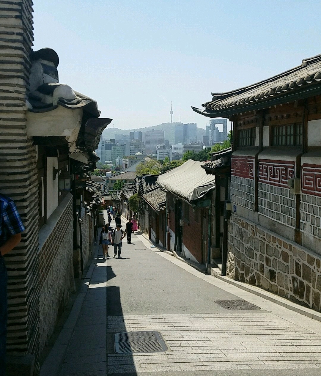 This morning when we get off the subway we are still some distance from our destination, Bukchon Village, but we enjoy walking the streets. At a hole in the wall we pause to buy grilled chicken skewers to stay our stomachs until lunchtime. We enter Bukchon Village gradually, and the streets become steeper and narrower, closely lined with small ancient houses. Most of them are private residences, but from the outside at least they look just like you’d expect old Asian homes to look: stone and brick walls, rows of tiny many-paned windows, and curving tile roofs. At the top of one particularly long street we stop to look back, out across the city to Seoul Tower on an opposite hill. By the time we’ve walked all the way back down, we are tired and choose to take a bus towards our barbecue lunch.